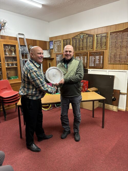 New league president Emmo Emmerson from Whitby presents Borough A team Doubles Captain Barrie Watson with the league trophy for the third consecutive year at the 2025 AGM